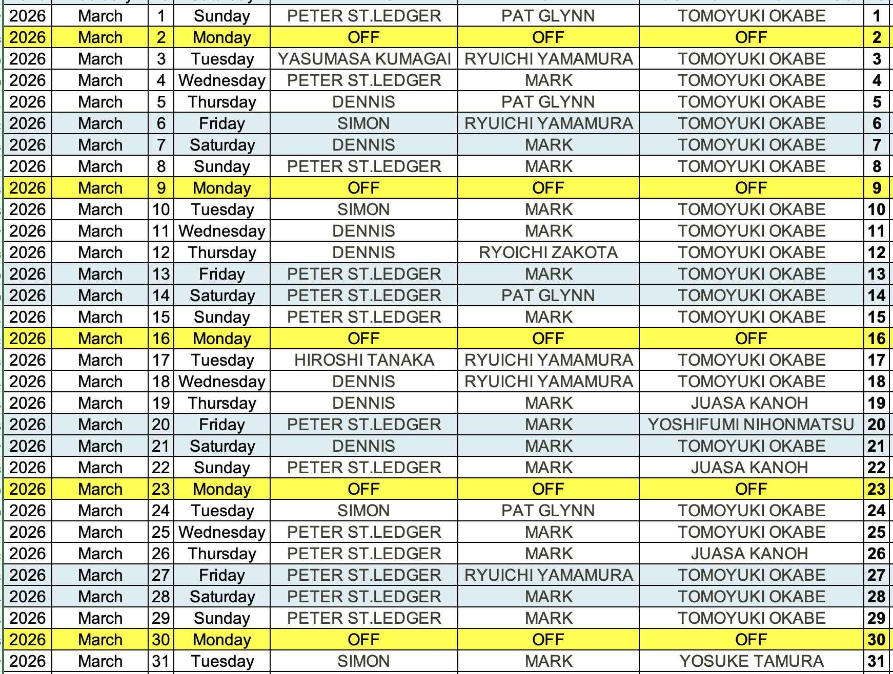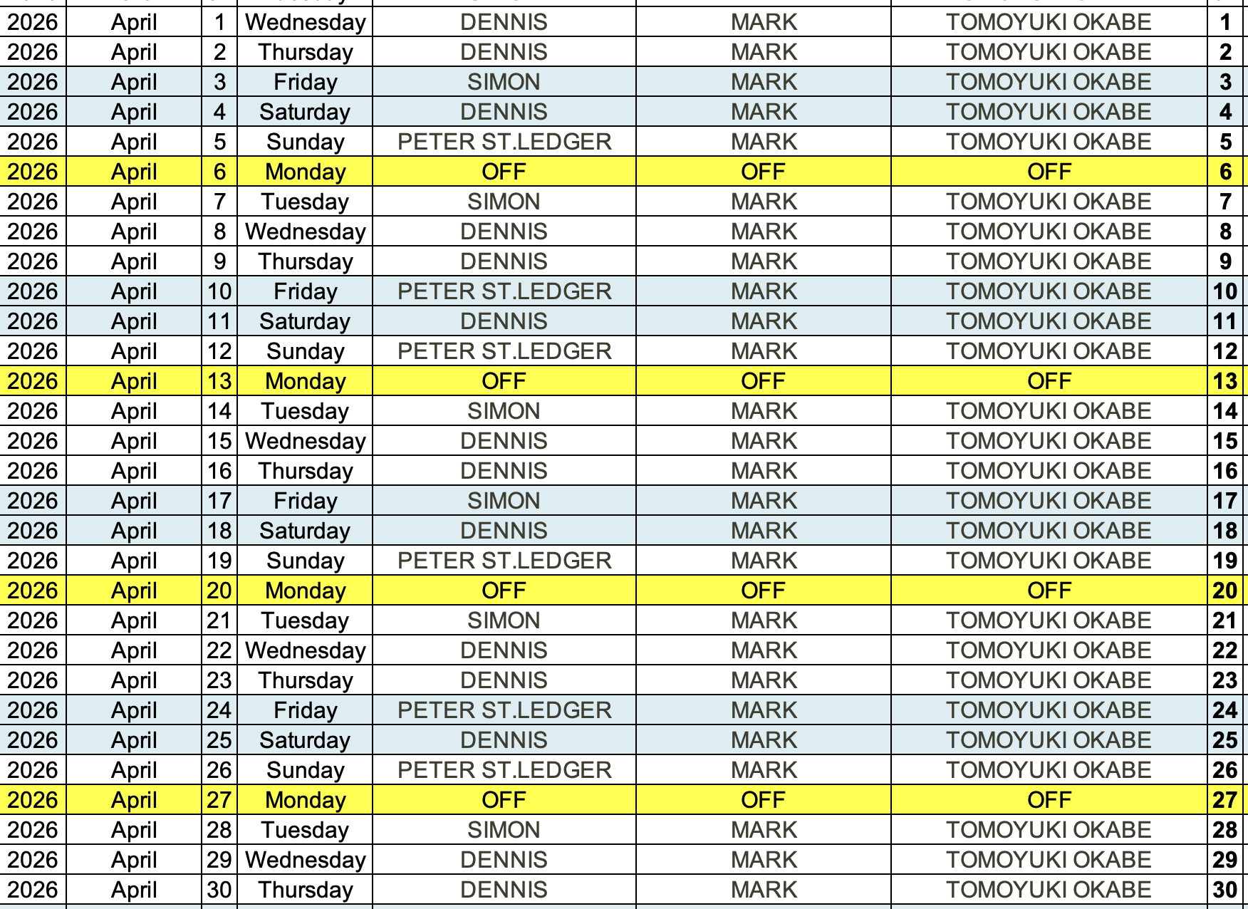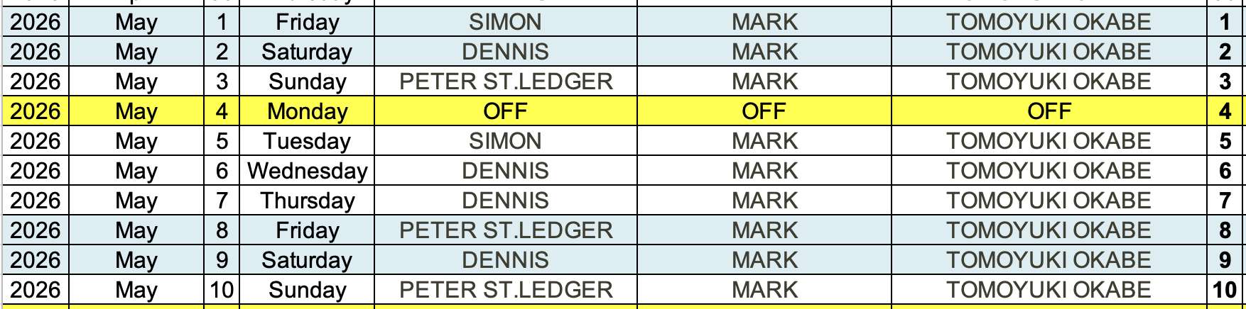 TUESDAY-WEDNESDAY-THURSDAY AND SUNDAYS